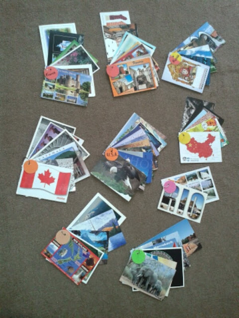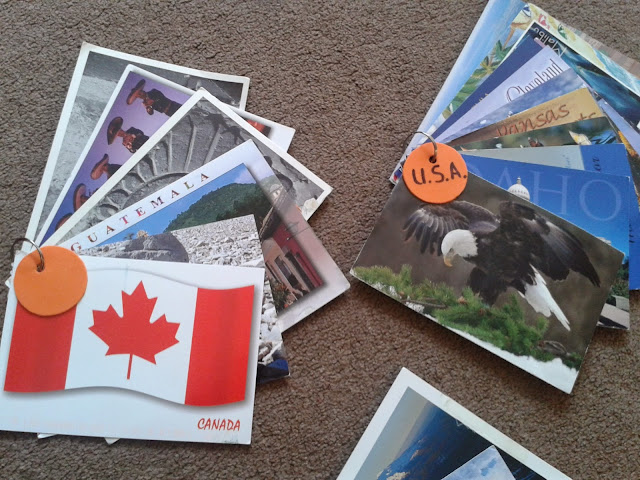 Toutes les cartes postales que nous avons reçues grâce à la famille, les amis et Postcrossing ne rentrant pas dans notre album, je les ai triées par continents (badges ronds aux couleurs des Continents Montessori), et attachées avec des anneaux de porte-clés, pour pouvoir les mettre dans nos boîtes de géographie.