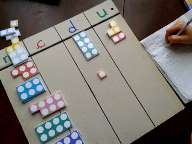 Je viens de découvrir les Numicon, et trouve l'idée géniale, car trés visuelle, encore plus que les baguettes cuisenaires ou les perles Montessori. Le site de numicon offre des pdf de travail gratuits. J'ai imprimé le carré de 100 sur du papier auto-collant que j'ai ensuite collé sur une plaque de mousse (foam board) et plastifié, pour des Numicon-maison.